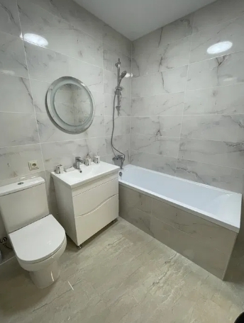 Меблювання: ліжко з підсвіткою, шкаф купе, ванна кімната (ванна з обладнанням, туалет, дзеркало, умивальник з тумбою), кухня, розкладний диван, стіл та стільці