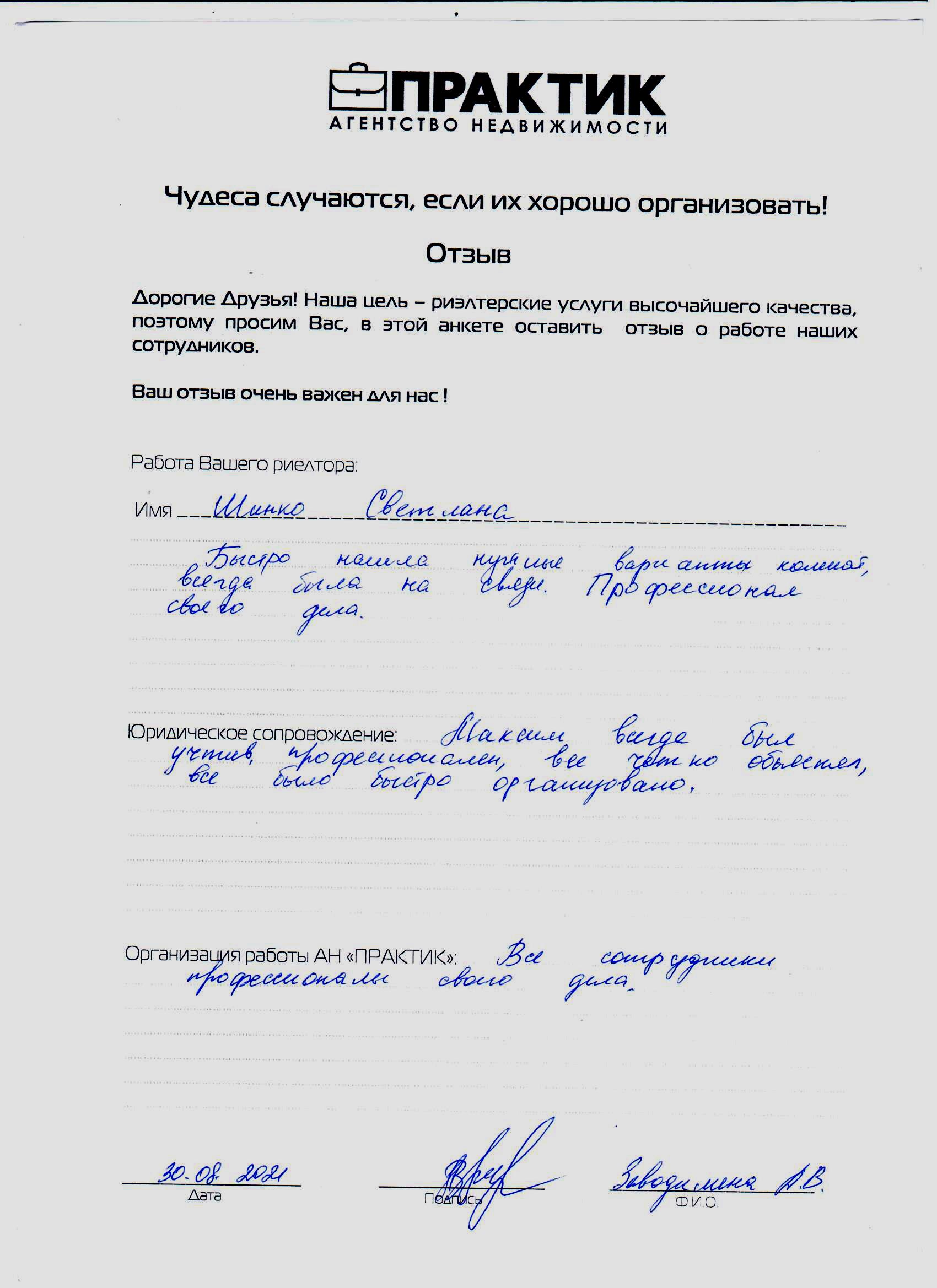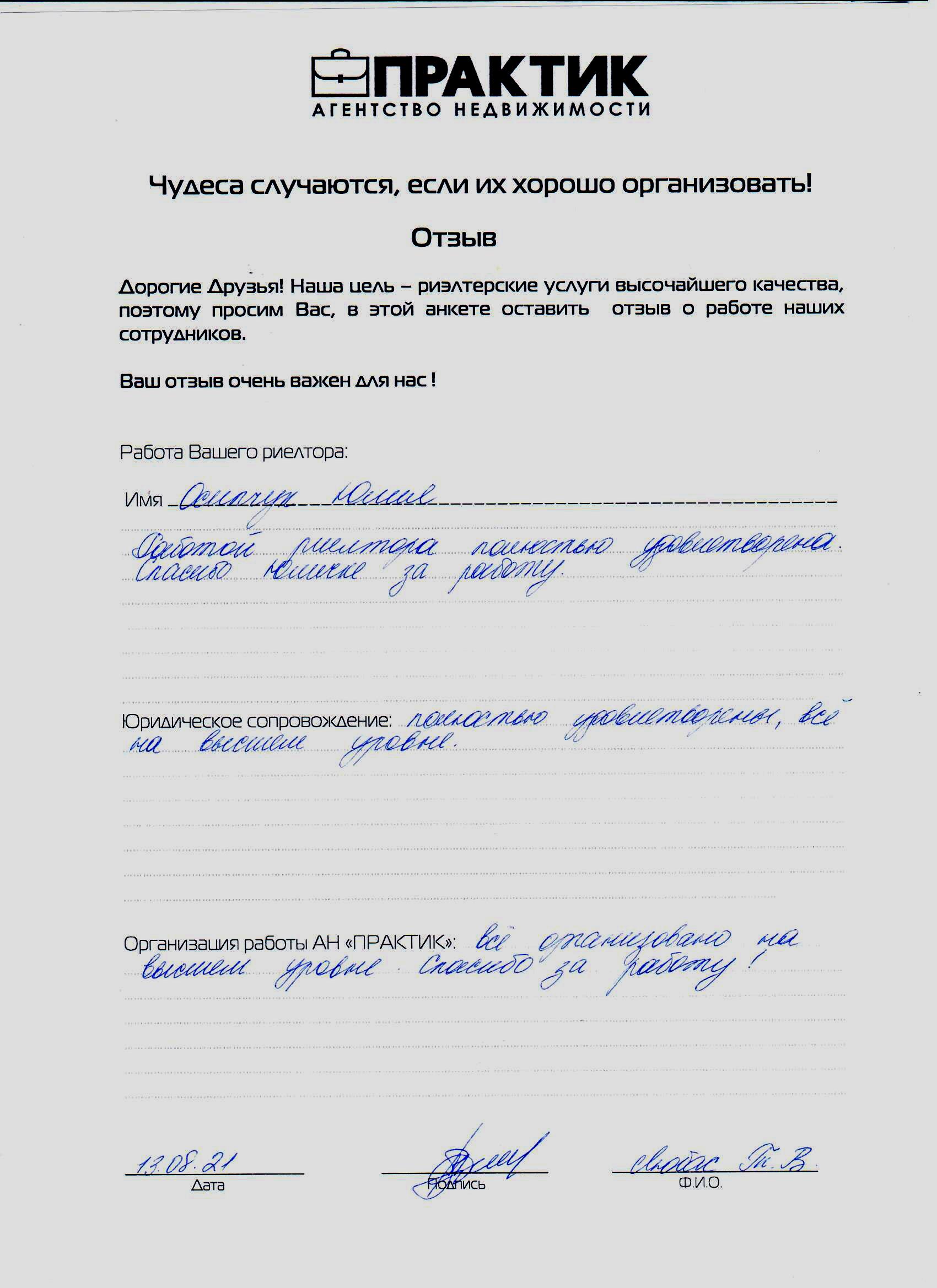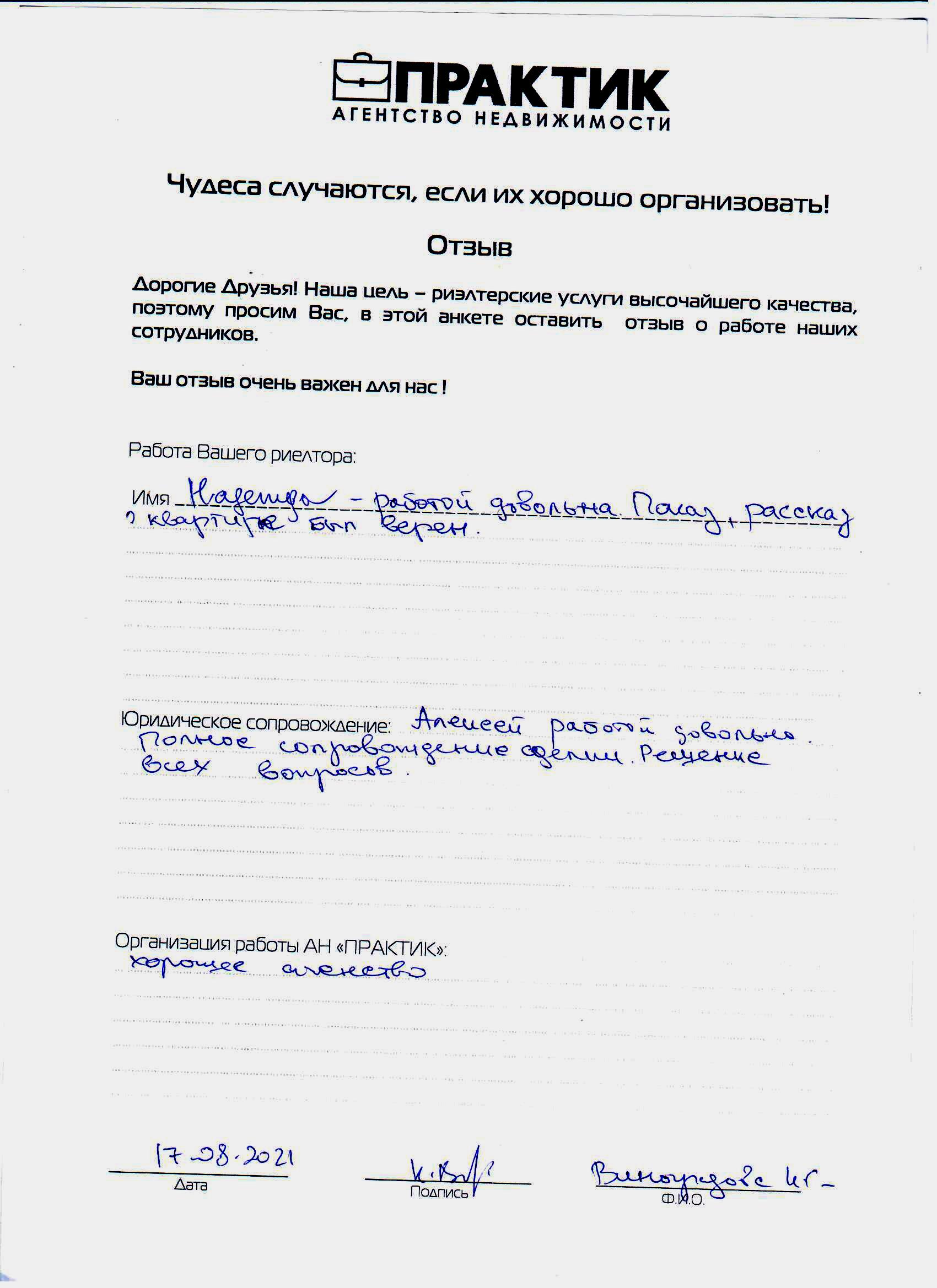 Відгук про роботу АН Практик від 17.08.2021 Виногродова И.С.