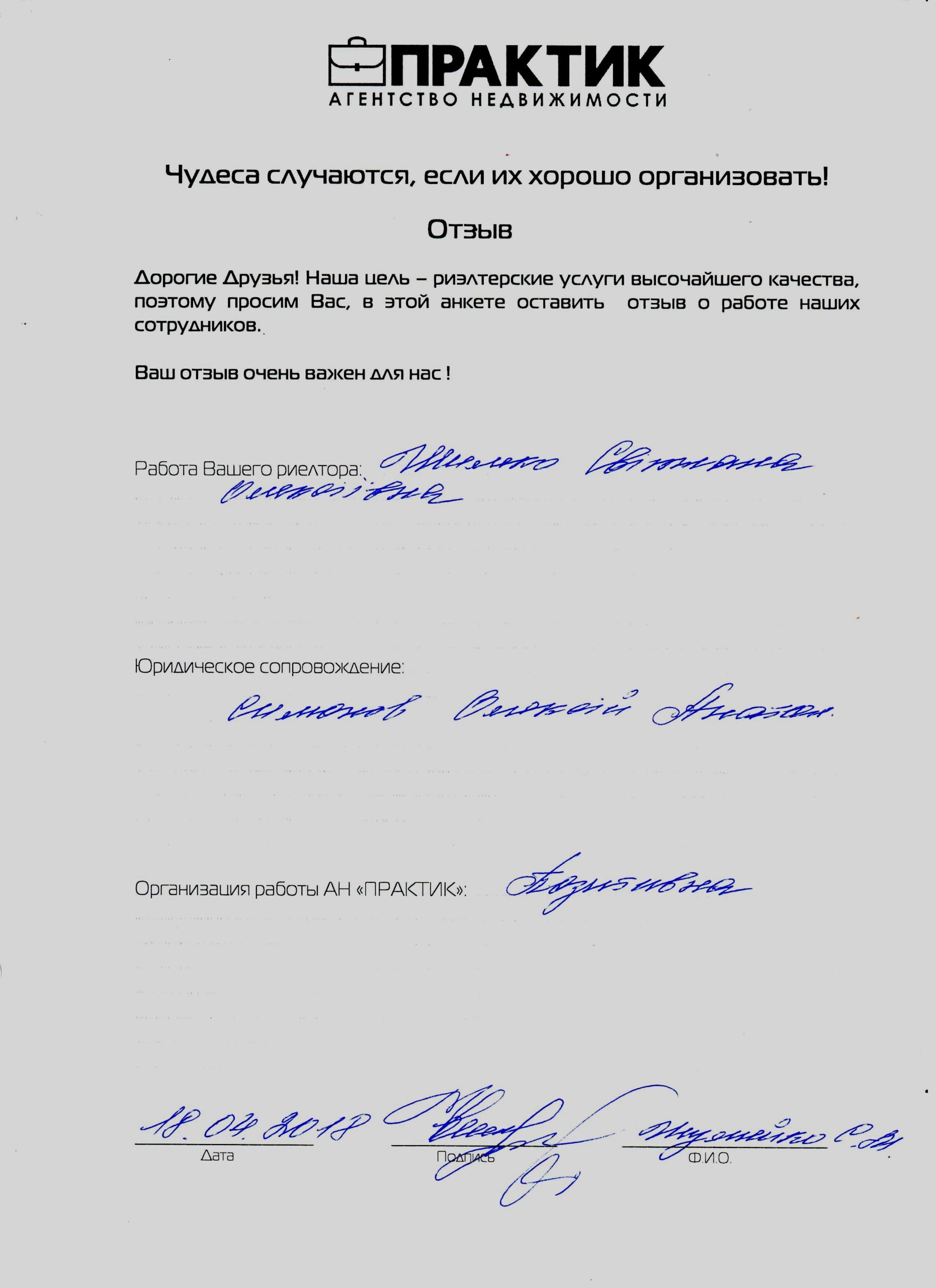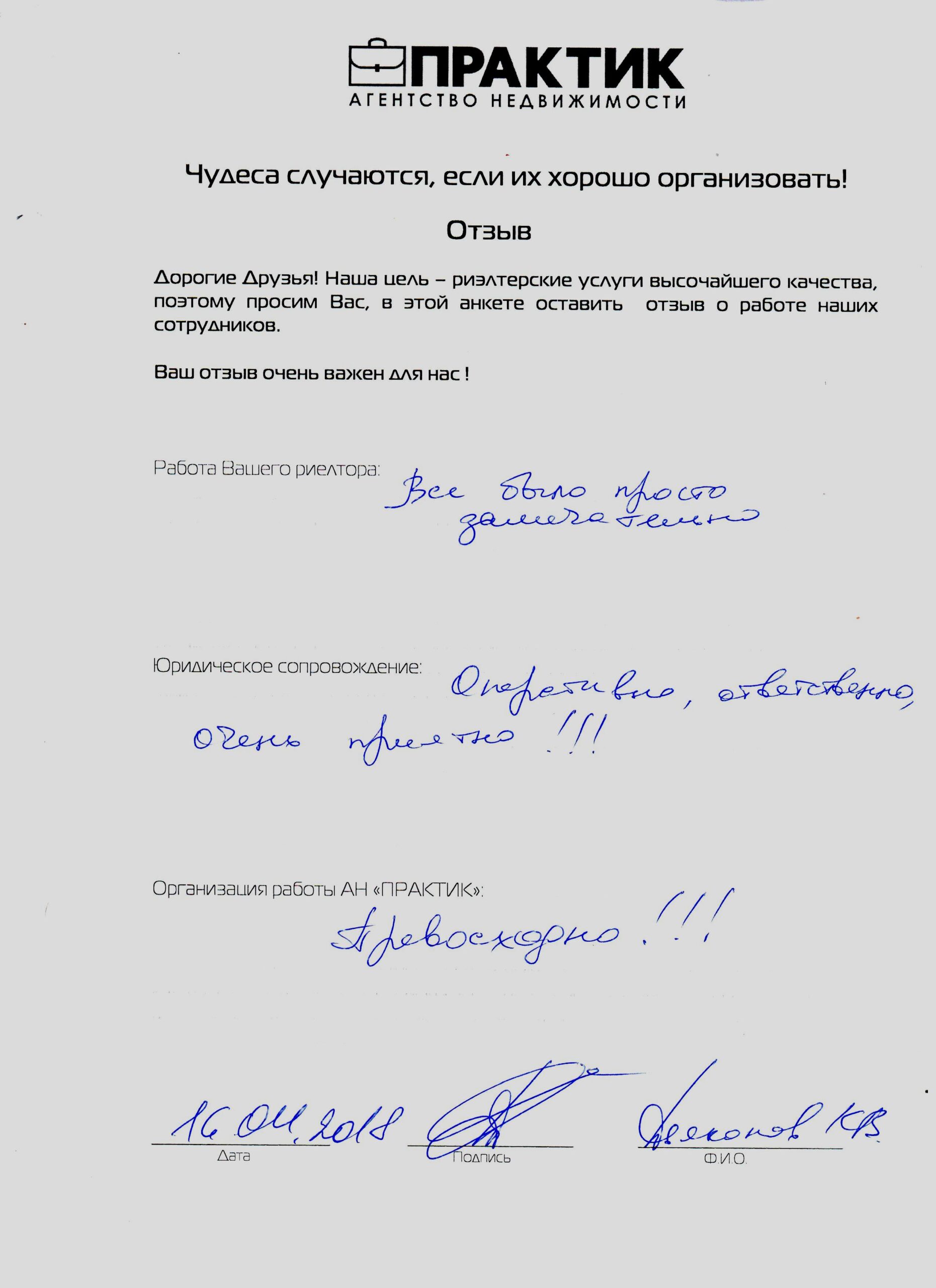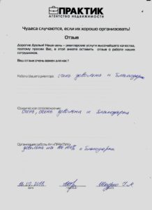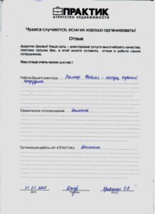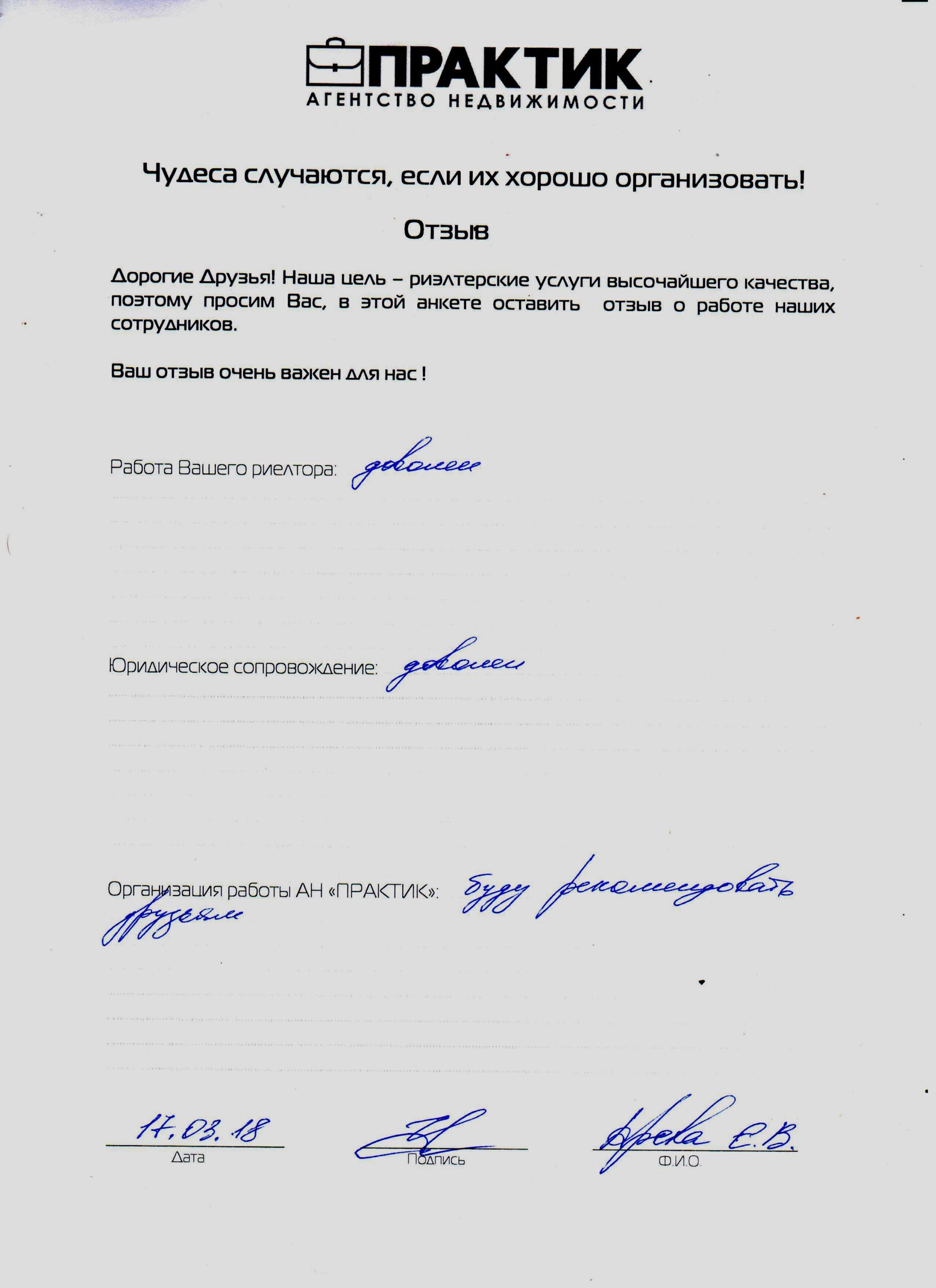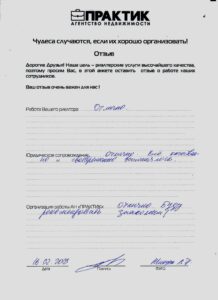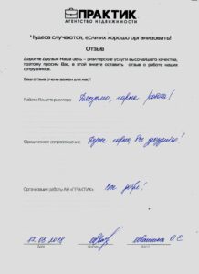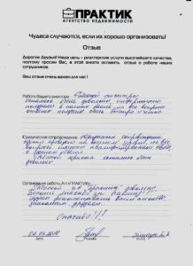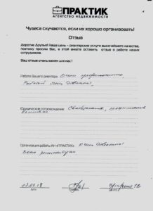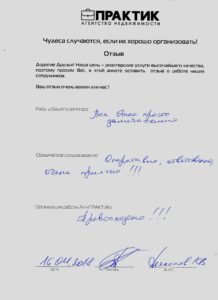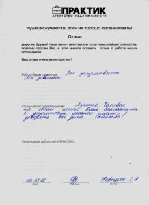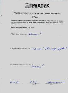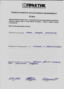 Организация работы АН"Практик": Работой АН"Практик" довольны. Большое спасибо за работу!!! Будем рекомендовать Ваше агенство знакомым, друзьям. Спасибо!!!