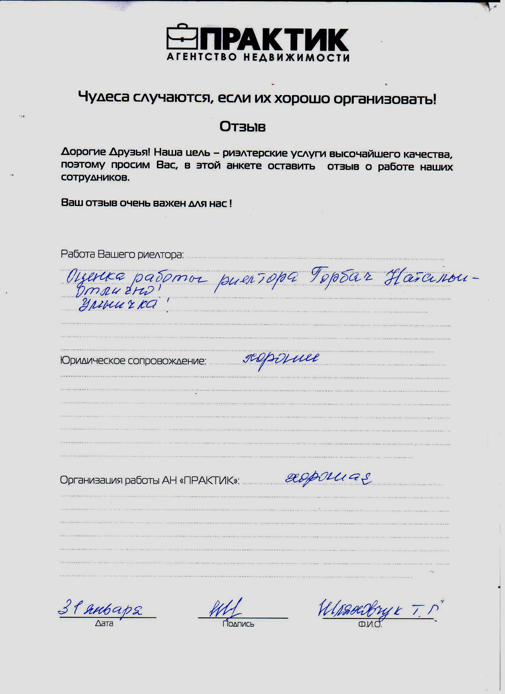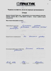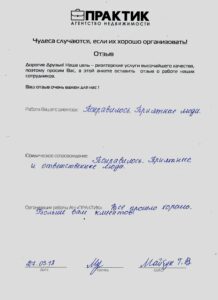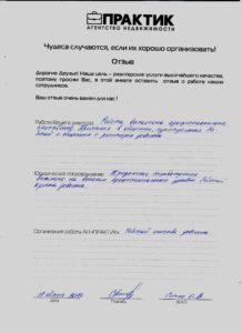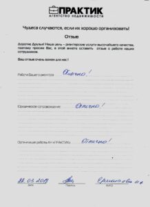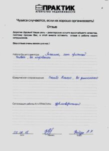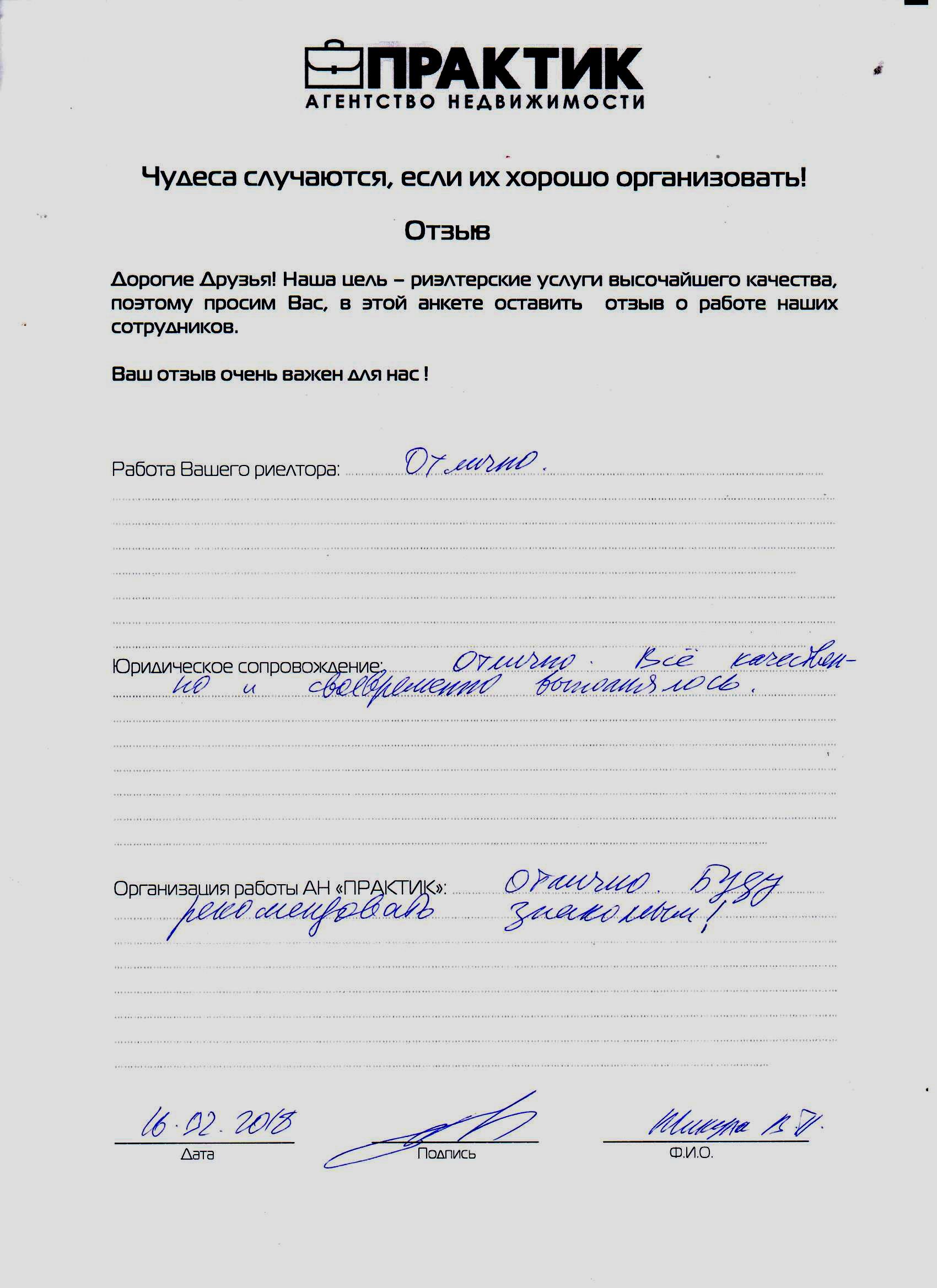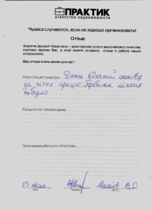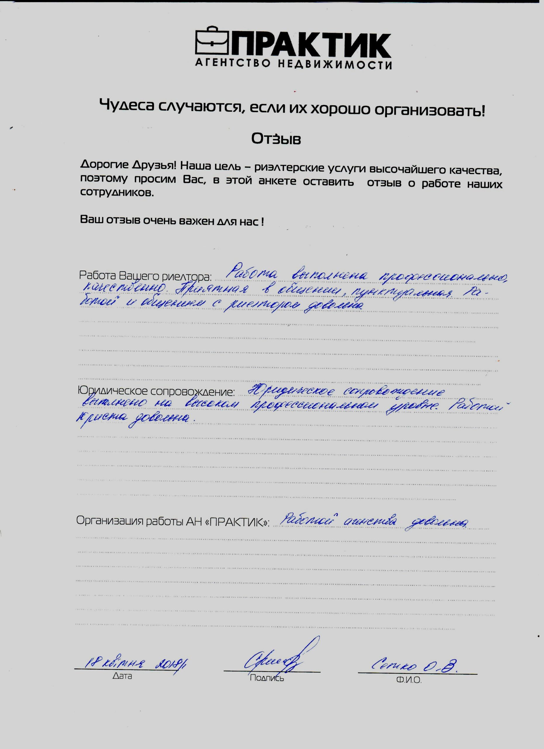 Организация работы АН"Практик": Работой АН"Практик" довольны. Большое спасибо за работу!!! Будем рекомендовать Ваше агенство знакомым, друзьям. Спасибо!!!