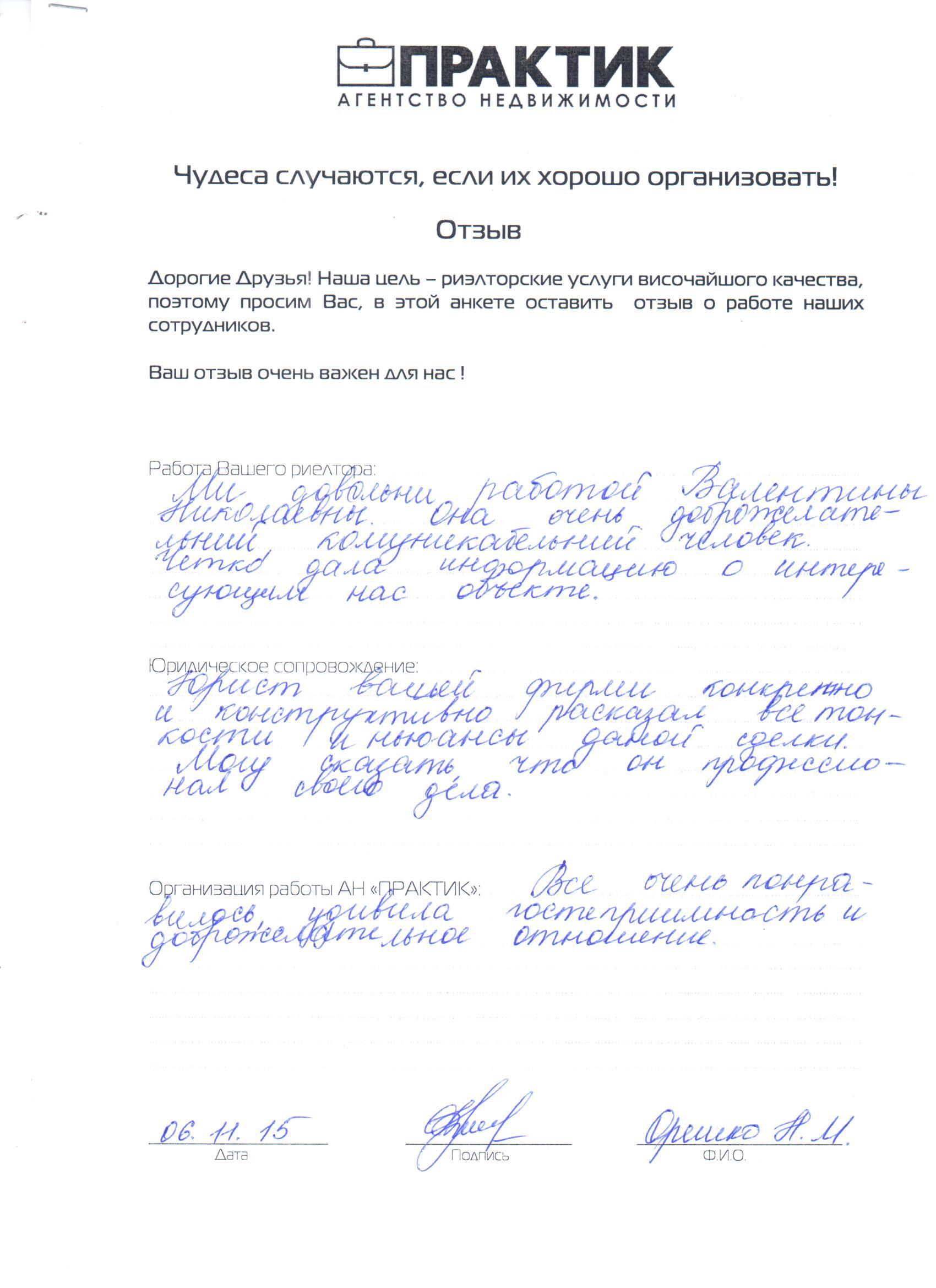 Відгук про роботу АН Практик від 06.11.2015 Орешко Н.М.