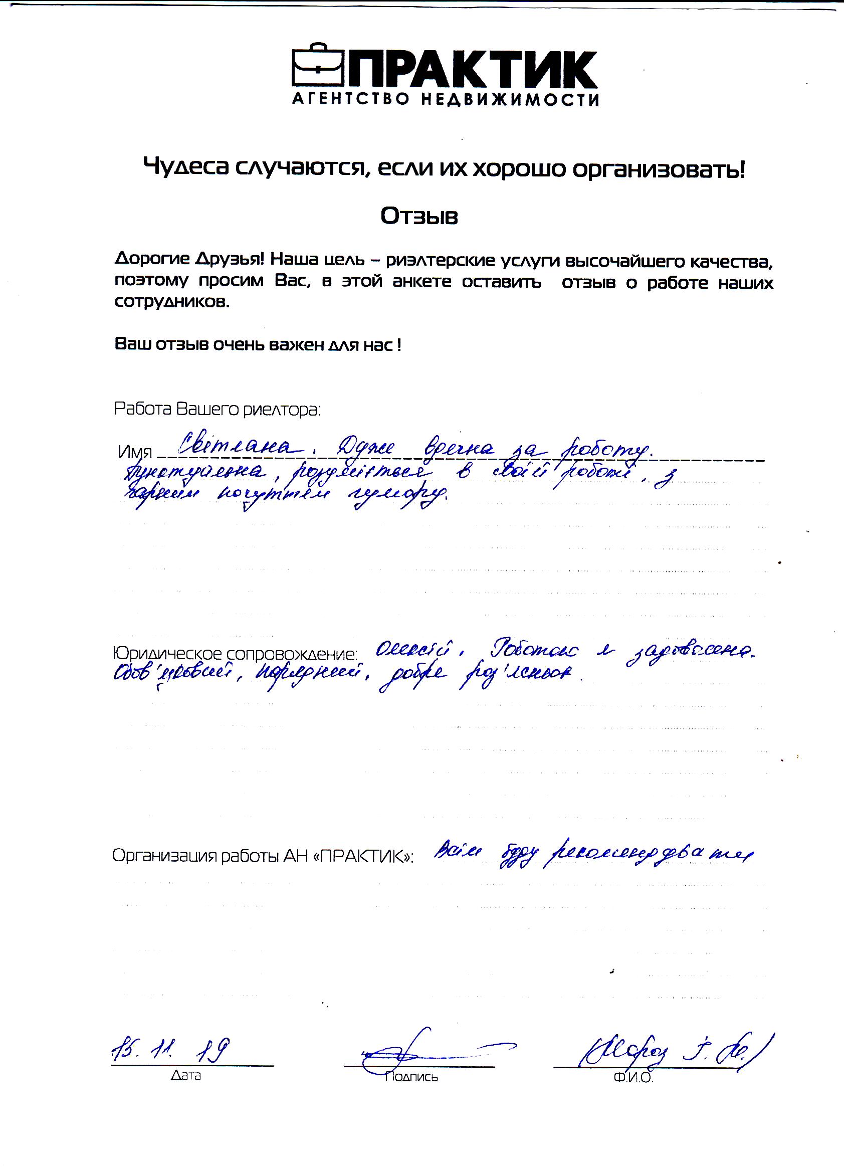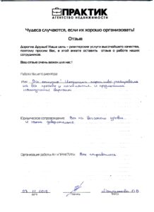 Юридическое сопровождение:Юристом очарована. Профессионал своего дела. Сделка прошла быстро и аккуратно. Наилучшее пожелания вашей фирме. Большое спасибо. Процветание Вам и долгих лет жизни вашей фирме.